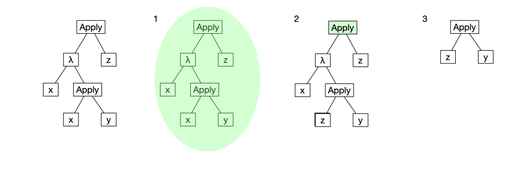 Here, we started with the expression (λx.x y) z which is an application of an abstraction λx.x y to a variable z. The parameter of the abstraction is x so we can rewrite it by replacing the occurrences of x in the abstraction with z. Sometimes it’s easier to understand if you draw out the structure of the expression as a tree, like this: