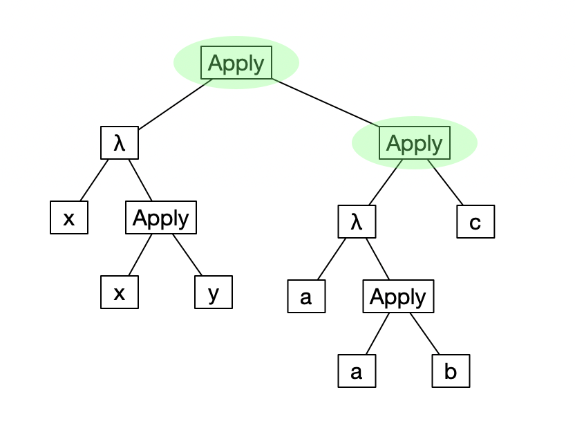 This has the following structure with two redexes (highlighted in green).