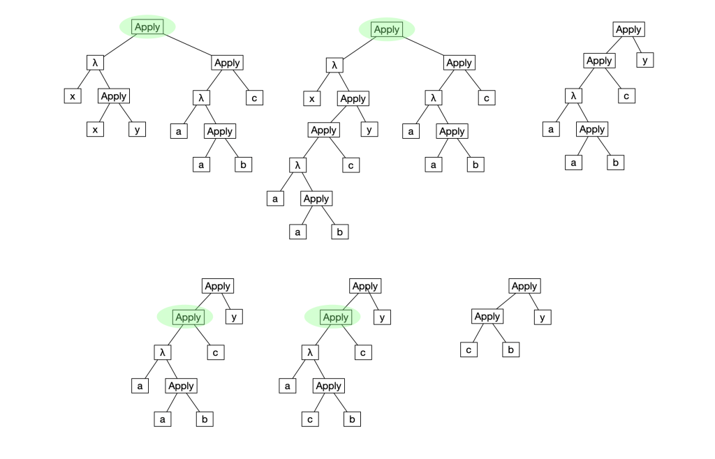 For this reason, the lambda calculator uses a strategy of “left most outermost” or “normal order” to pick a redex to rewrite. Essentially, it starts at the top of the tree representing the expression. If it’s a variable there aren’t aren’t any redexes. If it’s an abstraction it descends into the body of the abstraction and repeats. If it’s an application and the application is a redex, this is the expression chosen, otherwise it repeats the process with the first (or left) term and only searches the second (or right) term if it fails to find a redex on the left side. This guarantees that, if an expression can be reduced by successive rewrites to a point where there are no redexes left, it will be.